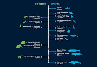 Gennem en ekstrapolation fra genetiske undersøgelser af arter med kendt levetid fandt vi ud af, at den uddøde uldhårede mammut sandsynligvis levede omkring 60 år, og at grønlandshvaler kan forvente at nyde mere end to og et halvt århundredes levetid.