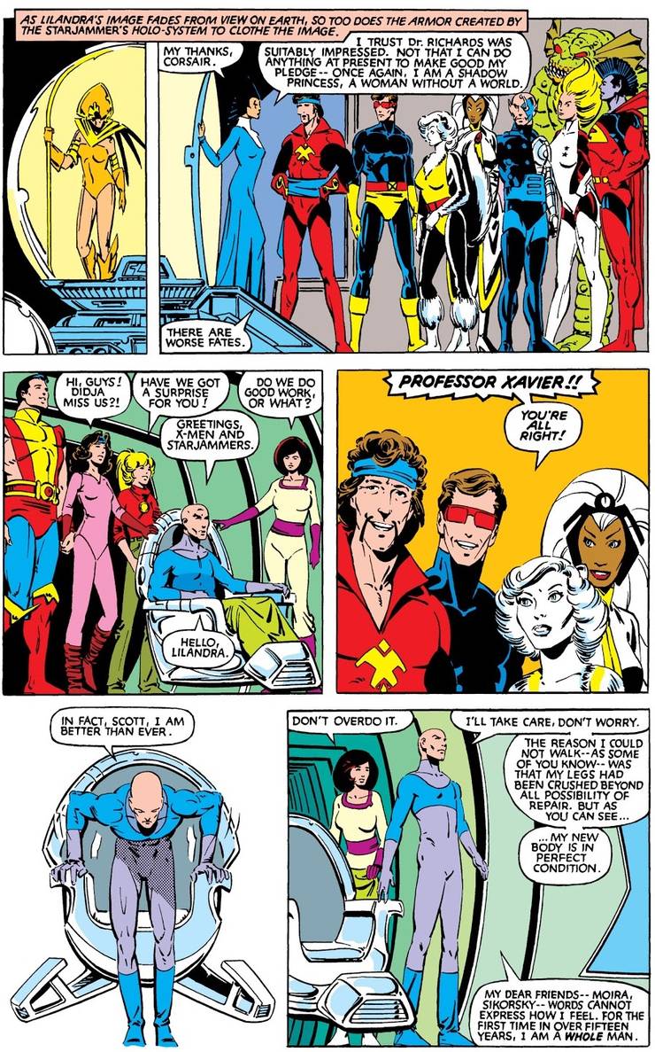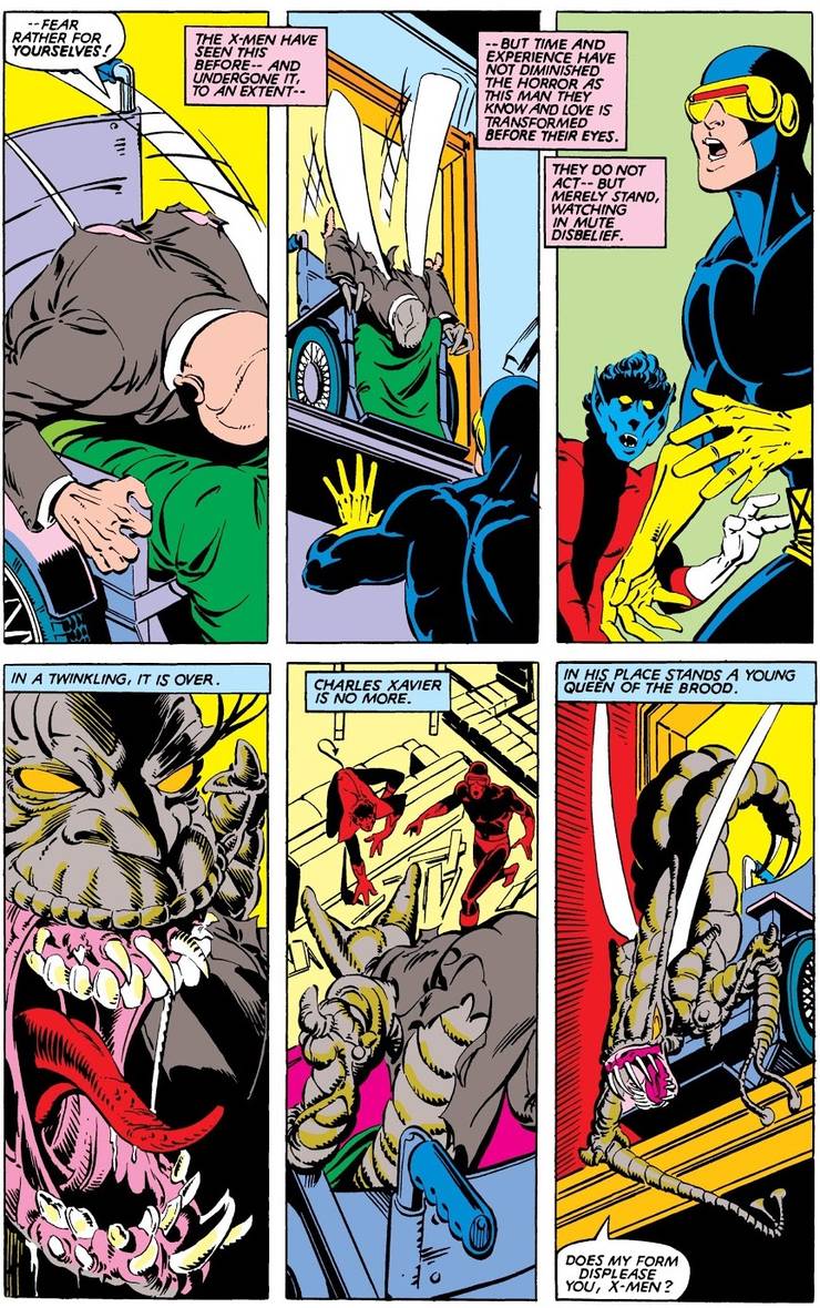 エグゼビアについては、Uncanny X-Men #167 (by Claremont, Paul Smith and Bob Wiacek) でブルード・クイーンに乗っ取られたときです…