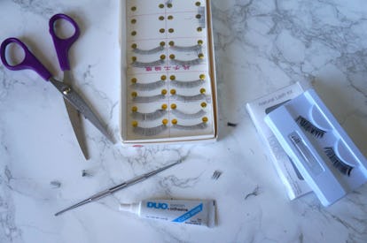 Primero reuní todos mis suministros: pestañas postizas, tijeras, pegamento para pestañas y un extractor (más sobre esto más adelante).